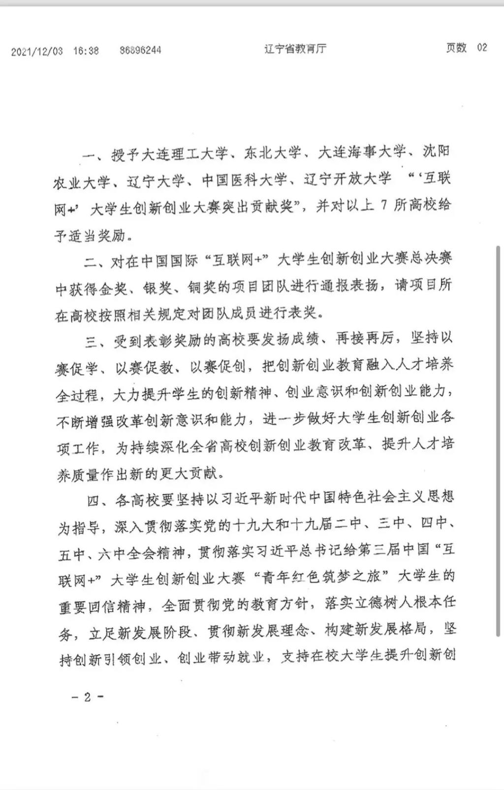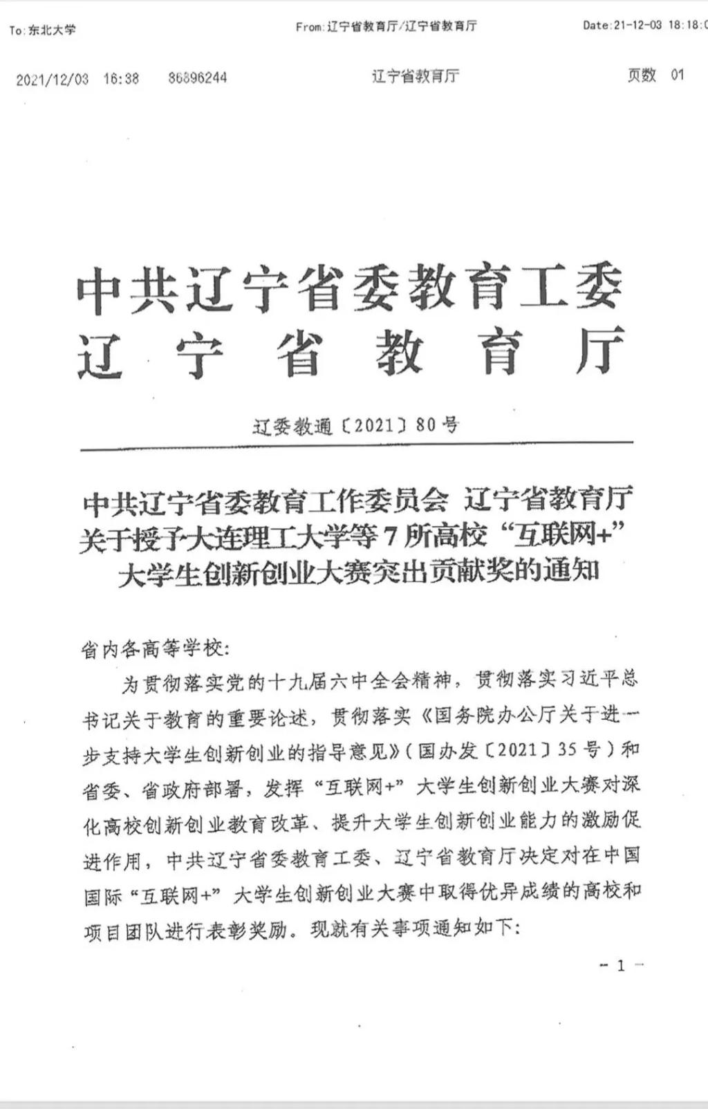 近日,中共辽宁省委教育工作委员会、辽宁省教育厅对在第七届中国国际“互联网+”大赛中取得优异成绩的高校和项目团队进行表彰和奖励,授予我校等7所高校“互联网+”大学生创新创业大赛突出贡献奖。
