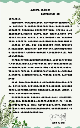 人员发来慰问信,鼓励大家用勇气与担当赢得疫情防控保卫战,并责成万博全站官网app