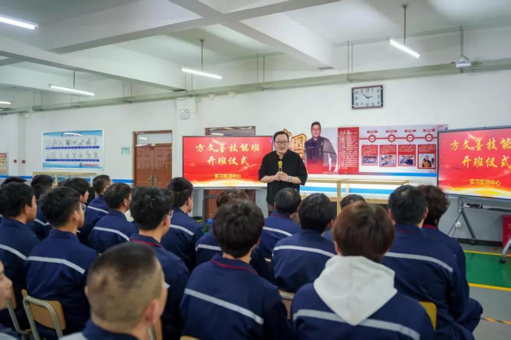 实习实训中心主任史立峰宣布方文墨技能班开班,他介绍了成立方文墨技能班的过程和意义,方文墨技能班是以大国工匠方文墨担任首席执教教师的第二课堂活动,学生们利用课余时间开展技术技能学习与训练。方文墨对学生提出了具体的学习要求,他鼓励同学们珍惜这次学习机会,勇于探索未知、不断突破自我、追求卓越。